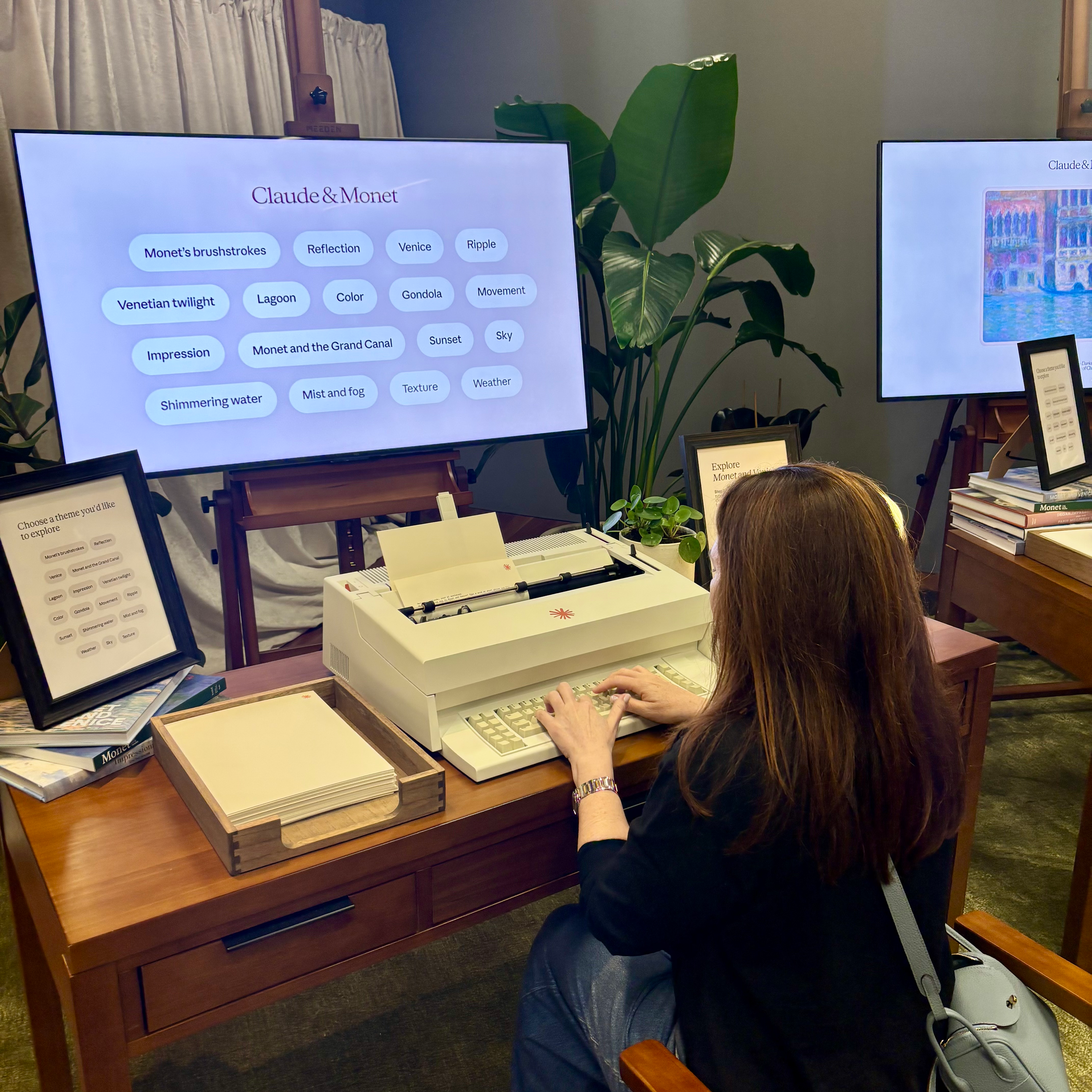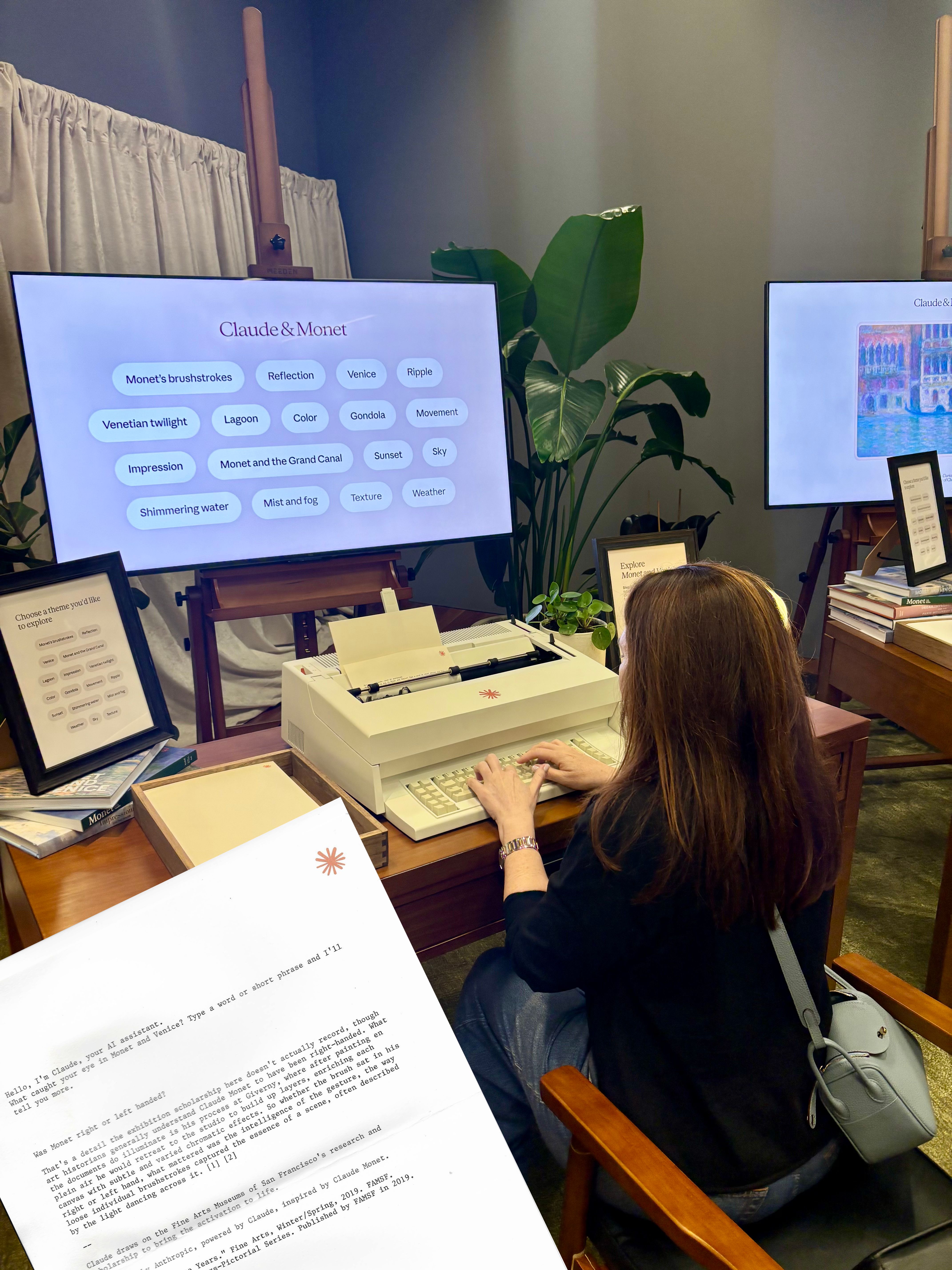 Two Claudes walk into a museum: There is a typewriter in the de Young Museum of San Francisco that is connected to an AI, which is connected to a 19th-century French painter: Claude and (Claude) Monet. The AI named after a man named after nothing in particular, now stationed inside an exhibition about the other Claude, answering visitor questions on cream paper in monospace type, citing the museum's actual Monet scholarship in its footnotes. While apparently, I was the only one in line who had ever seen or used an ‘80s word processor, I sat down and typed: was Monet right or left handed? At first, Anthropic’s Claude wasn’t sure, but it pivoted to give me what it thought might be the right answer, using the Museum’s knowledge on Monet and his painting techniques. (See the response below.) The activation was really thoughtful, and the Monet in Venice exhibit was beautiful. We were particularly entranced by Monet’s determination to paint the air. If you are in San Francisco, give it a whirl.